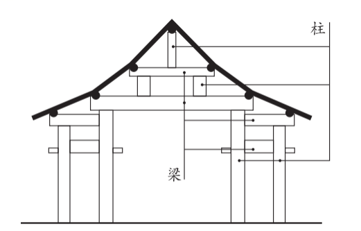 梁是截面形状一般为长方形的木料,且木料的长度尺寸远大于截面尺寸。梁为水平放置,两端的底部有支撑构件。梁主要用于承担建筑上部构件及屋顶的全部重量,并把这些重量向下传给支撑构件。柱为梁的支撑构件。柱子截面形状一般为圆形,长度尺寸远大于截面直径。柱子为竖向放置,主要用于承担上部梁传来的重量,并向下传递给下部的梁或直接传至地面。梁与柱采用榫卯形式连接,形成稳固的大木结构体系。位于屋架内的若干梁在竖向被层层往上“抬”,上下梁之间由短柱支撑,底部的梁由立于地面的立柱支撑。梁、柱均为中国木结构古建筑的核心受力、传力构件,缺一不可。